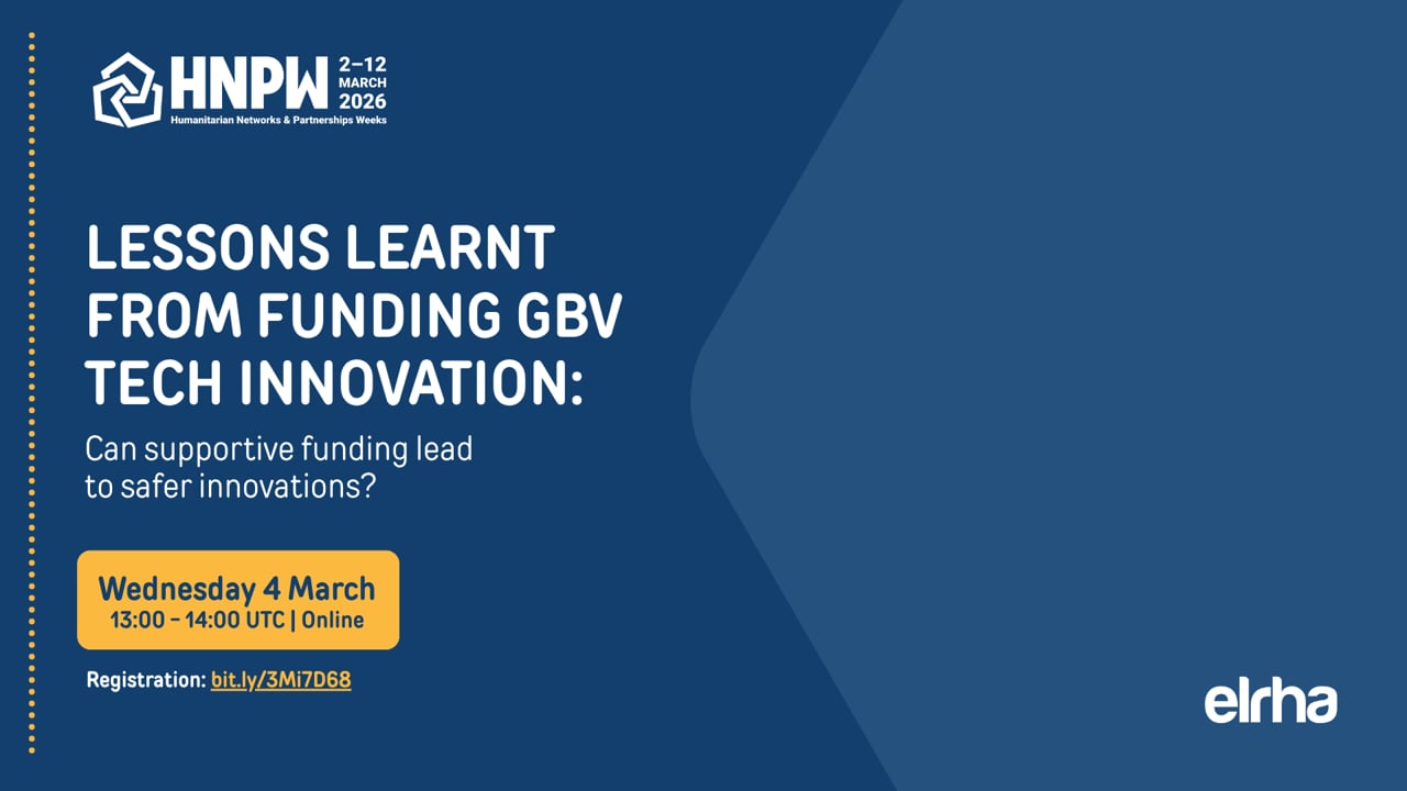 In this webinar you will hear what we learnt through Elrha’s GBV Tech Innovation Challenge. We will be sharing findings from a review, which drew together learning and good practices for supporting safe, ethical innovation using digital technology to transform GBV programming in humanitarian emergencies.